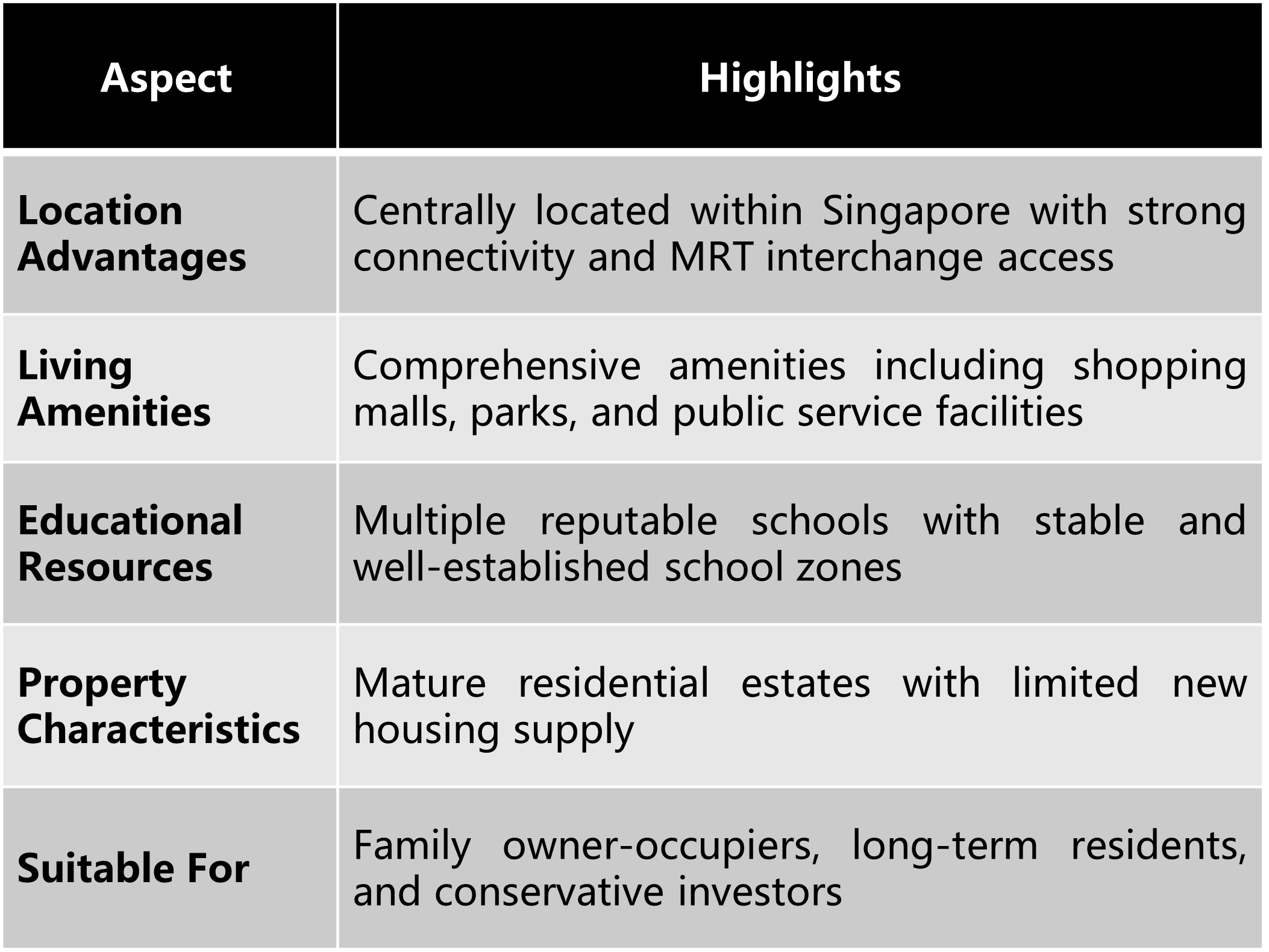 • A large concentration of mature HDB estates: Primarily owner‑occupied, supported by an active resale market and strong community stability